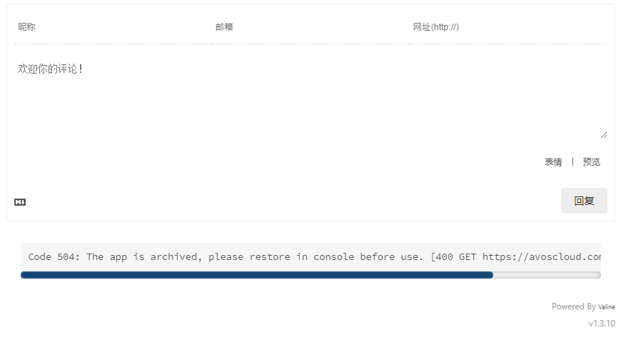 原因是:valine超过30天没有使用被停止,存储服务数据已归档(连续30天无API请求)